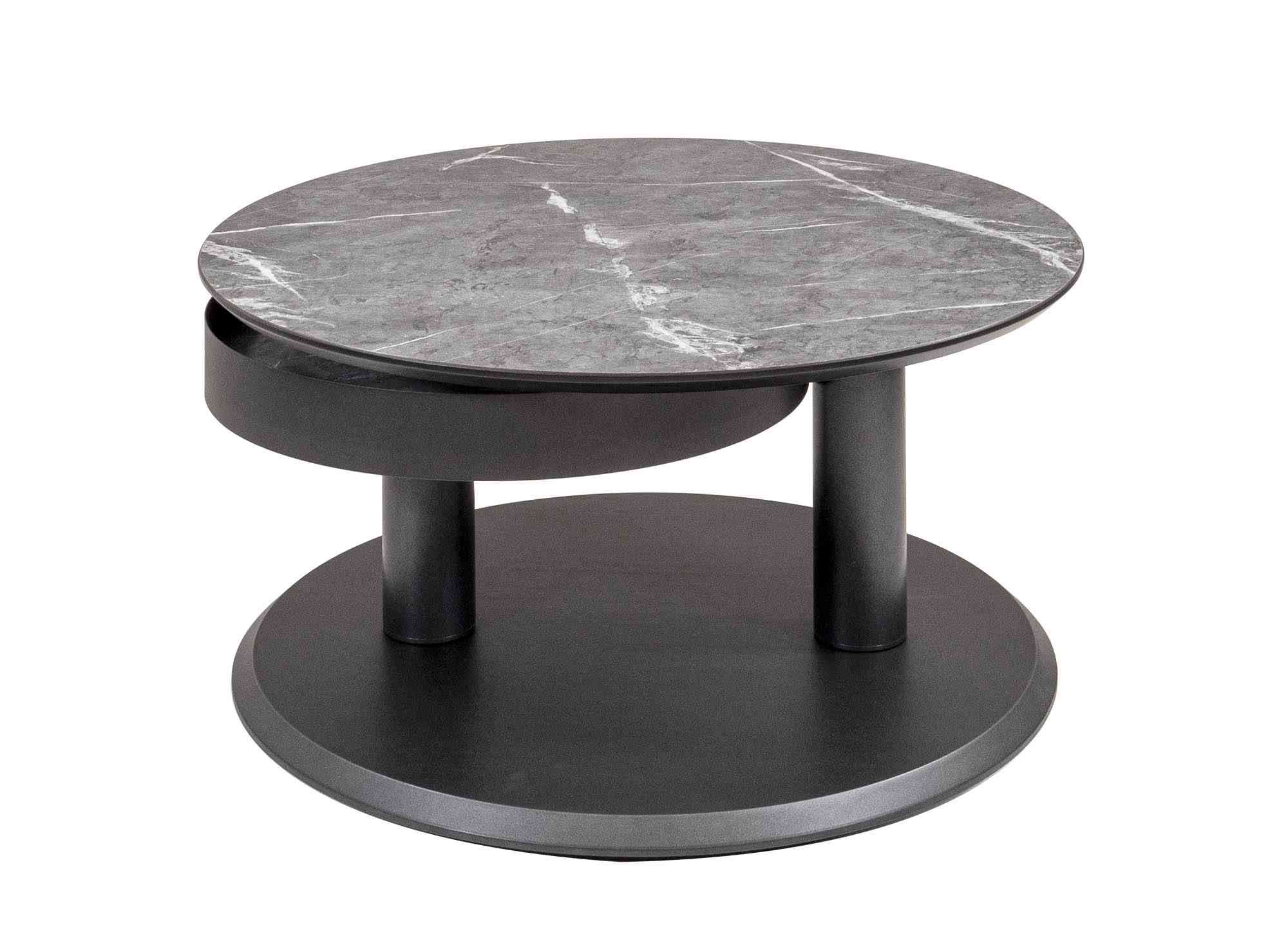 Oberfläche MDF mit HPL Auflage Marble Grigio mit Schweizer Kante, Gestell Synchron-Verdrehung, Ablagefach Stahl anthrazit metallic lackiert, Einlagefläche HPL Marble Grigio, Säulen Aluminium anthrazit metallic, Bodenplatte MDF anthrazit metallic Schliffoptik lackiert, DH ca. Ø 75(125)/Ø 75(91)/43+38 cm